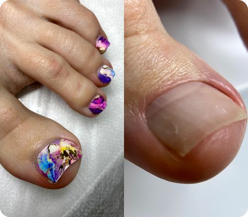 В этой технике выполняется лечебный педикюр. Восстанавливается нормальный рост ногтевой пластины, избавляем клиентов от скручивания, истончения и утолщения ногтей. Делаем профилактику грибковых инфекций. Техника в которой прорабатывается межпальцевое пространство, убирается сухость, шелушения и мозоли, также выполняется профилактика грибка.